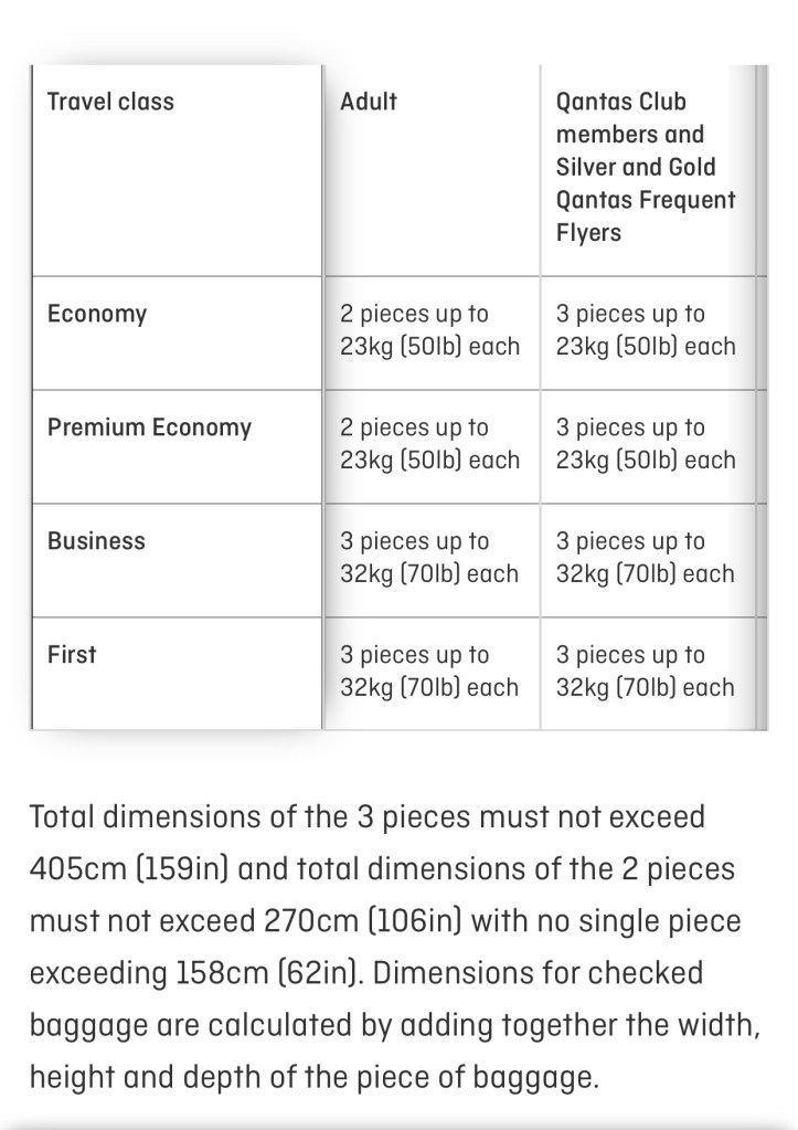For a lot of airlines and depending on where you go, they have different weight based baggage allowances. For example, whenever I fly to Colombia, I have to make sure that my luggage is about 23 kilos or less than 50 lbs. When I traveled to Australia, since their airline, Qantas, has larger aircrafts, they have different travel classes, like economy, economy business, etc. And they have different baggage allowances for travel, take a look!