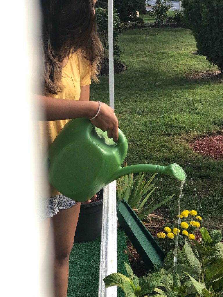 Since I’m home all the time now, I try to help my mom out by watering the plants in our garden.